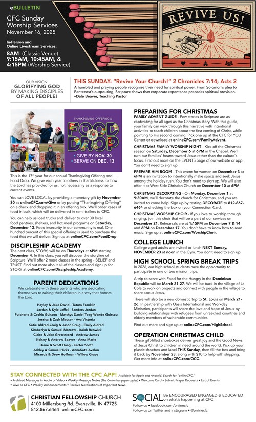 Stay up to date with what's happening at CFC by reading the eBulletin each week.