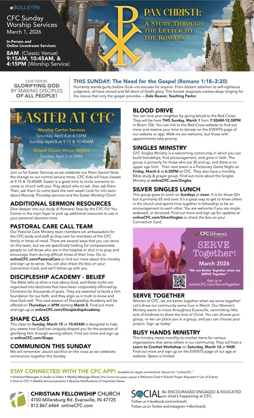 TOGETHER - Membership at CFCStudy Questions for March 9, 2025Jesus and His Service to PeopleStudy Questions for March 16, 2025Jesus and His Mission on EarthQuarterly Operations ReportWhat an Encouragement - Membership ClassStudy Questions for March 23, 2025Jesus and the Sacrificial LifeStudy Questions for March 30, 2025You've Been ServedEaster is 3 Weeks Away
