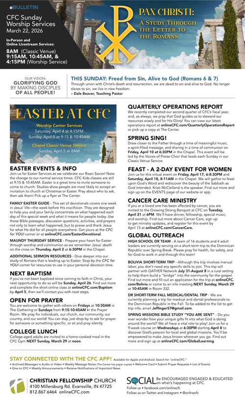 TOGETHER - Membership at CFCStudy Questions for March 9, 2025Jesus and His Service to PeopleStudy Questions for March 16, 2025Jesus and His Mission on EarthQuarterly Operations ReportWhat an Encouragement - Membership ClassStudy Questions for March 23, 2025Jesus and the Sacrificial LifeStudy Questions for March 30, 2025You've Been ServedEaster is 3 Weeks Away