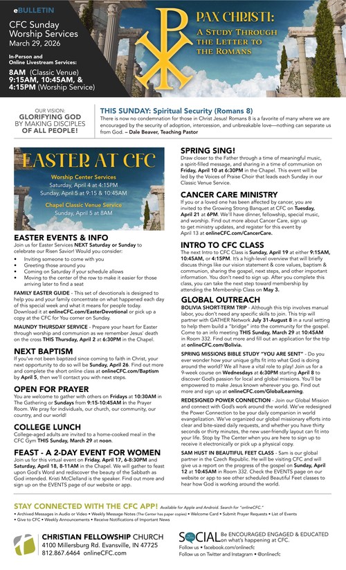 TOGETHER - Membership at CFCStudy Questions for March 9, 2025Jesus and His Service to PeopleStudy Questions for March 16, 2025Jesus and His Mission on EarthQuarterly Operations ReportWhat an Encouragement - Membership ClassStudy Questions for March 23, 2025Jesus and the Sacrificial LifeStudy Questions for March 30, 2025You've Been ServedEaster is 3 Weeks Away