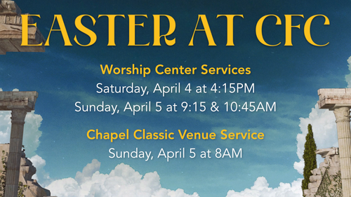 Please join us on Easter to celebrate our Risen Savior. We will have 4 services (with CFC Kids' Classes at 9:15 and 10:45AM only). Find out more about CFC and about kids' classes at the link below. (Note the schedule change from our normal service times.)