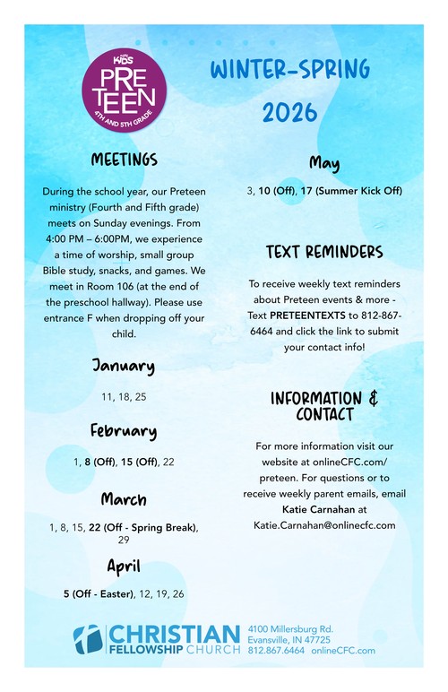 Fourth and Fifth Grade kids are in a unique stage of their mental and spiritual development. Preteens move from a stage of gaining biblical knowledge into a greater season of applying that knowledge. On Sunday nights throughout the school year, we set aside time for building relationships with trusted adults and peers who are dedicated to the truth that God has given to us from His Word. During the school year from 4:00 PM – 6:00PM, we experience a time of fellowship, small group Bible study, snacks, and games. We meet in Room 106 (at the end of the preschool hallway). Please use entrance F when dropping off your child.